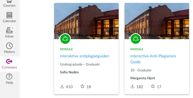 I Canvas finns en funktion som heter Canvas Commons där du kan söka efter olika typer av lärresurser på olika språk. Där hittar du bilder, videor, kurser, färdiga moduler och flervalsfrågor (quizer).