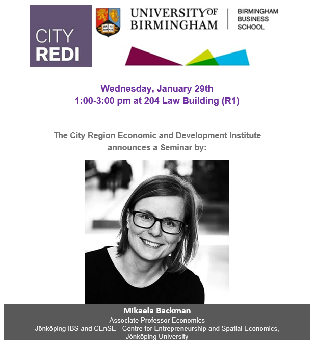 CEnSE Co-Director Mikaela Backman is visiting University of Birmingham, to give a seminar on her recent research on entrepreneurship and ageing.