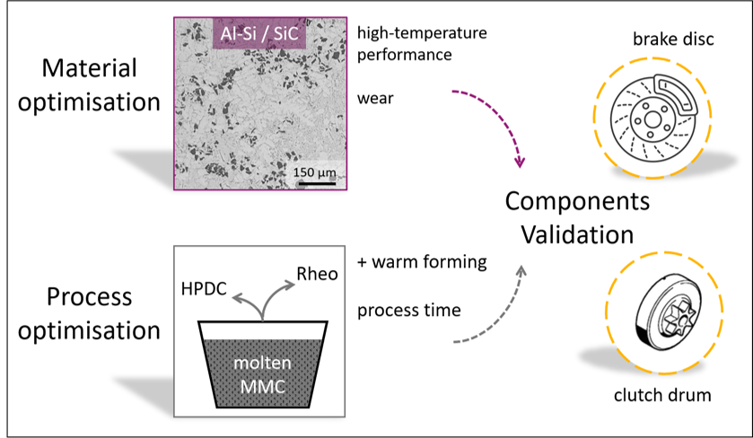 The research project ProForAl (Properties and formability of Al-SiCp MMCs) has two primary goals. One is to optimise the composition of the Al-SiCp composite to improve its performance at high temperatures. The other is to optimise the production method to increase the productivity and thereby reduce the manufacturing costs.