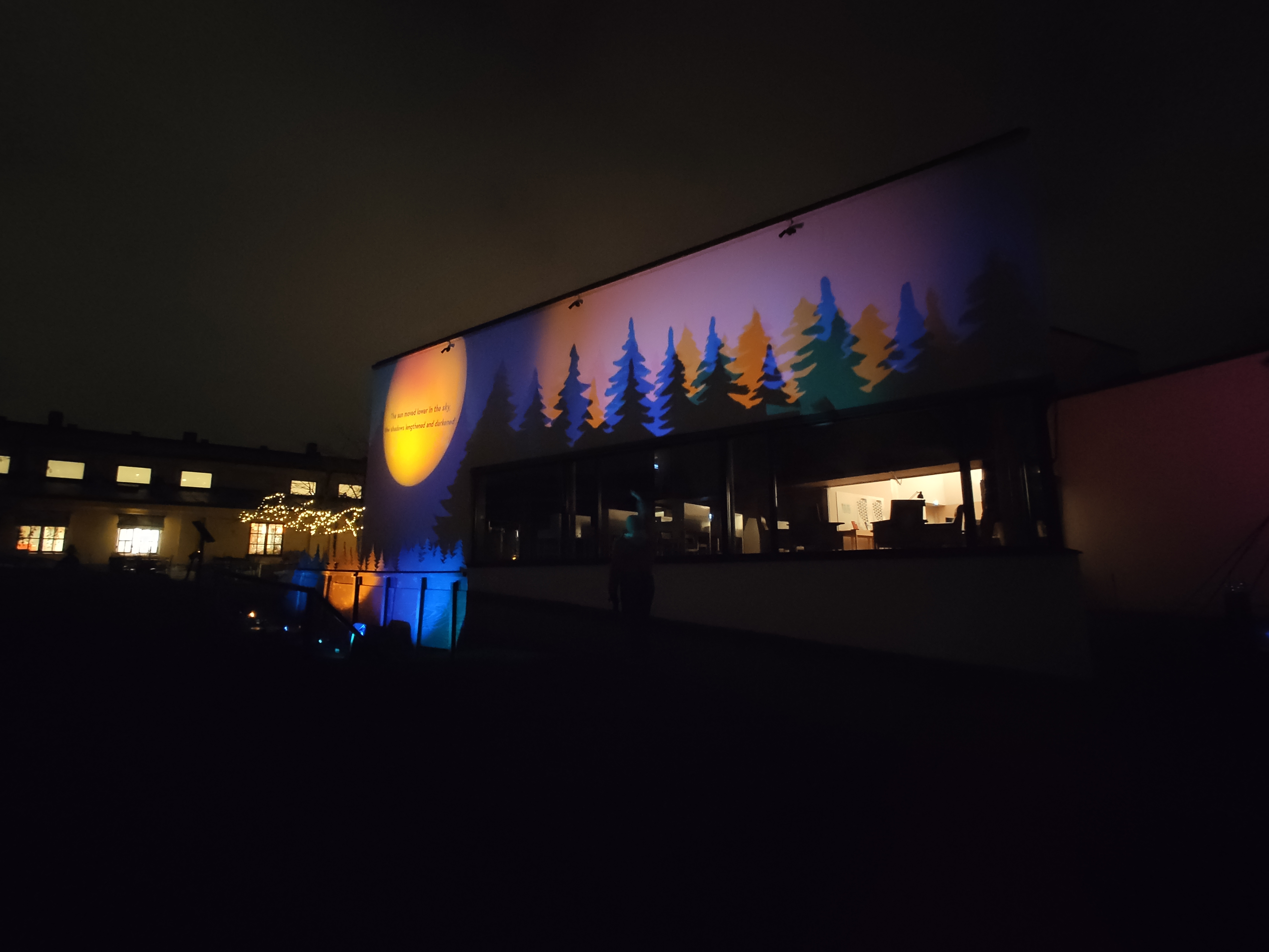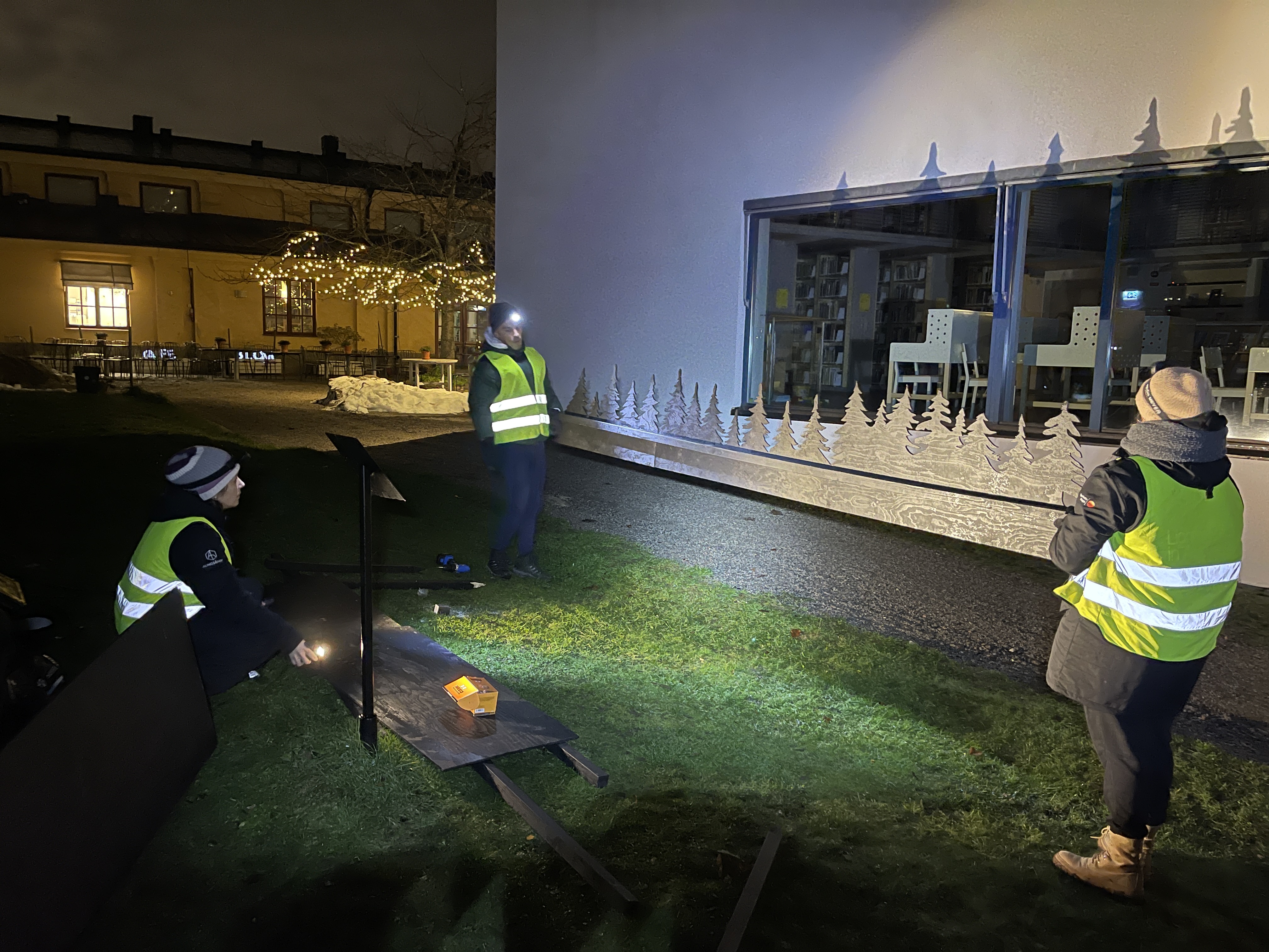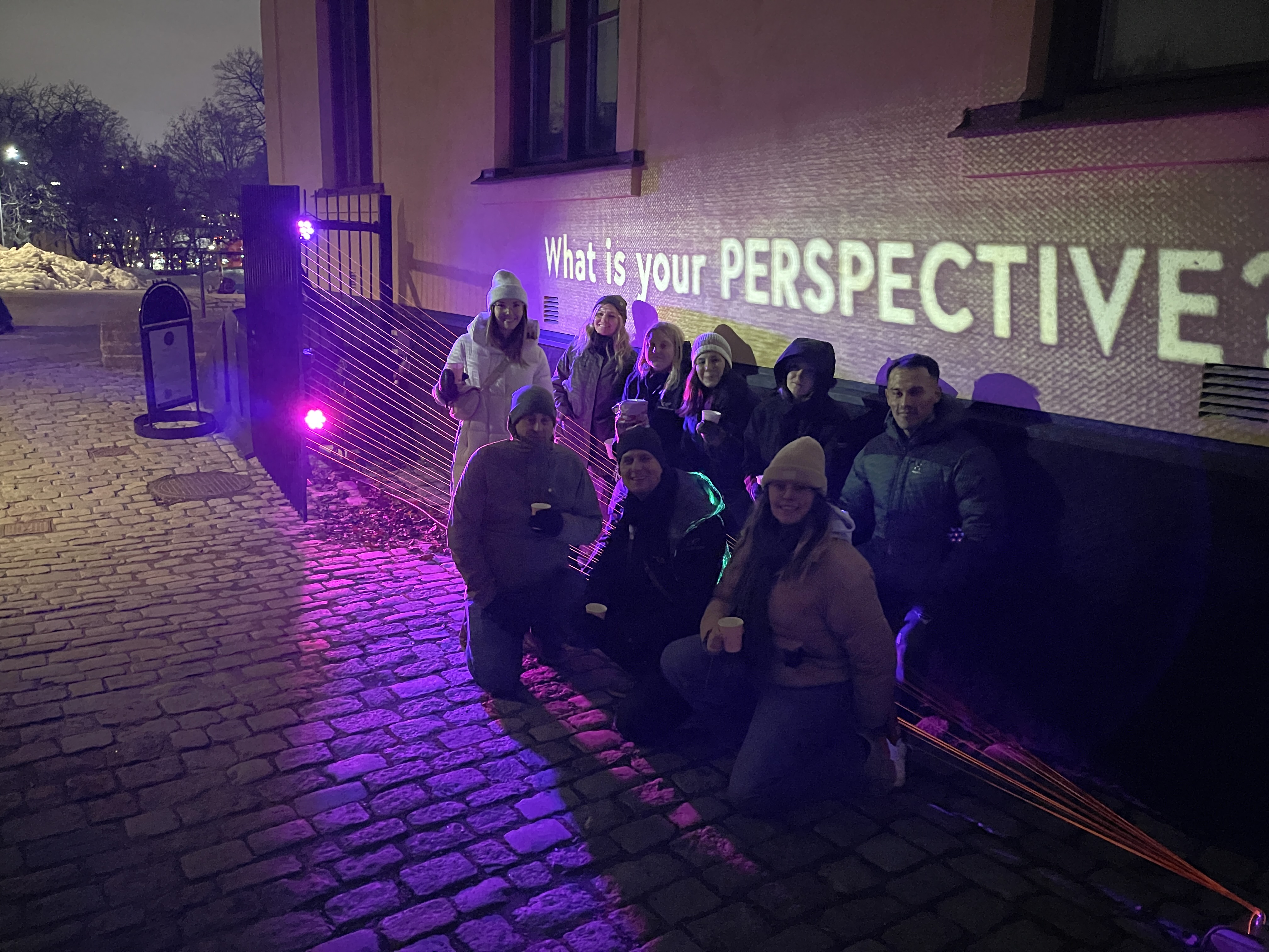 Studenterna berättar att det var kallt och mycket slit med att rigga ljusinstallationerna, men att det gick bra. ”Perspective” är en omfattande installation med över 65 armaturer och många detaljer att ta hänsyn till, allt från programmering till stöldsäkerhet.