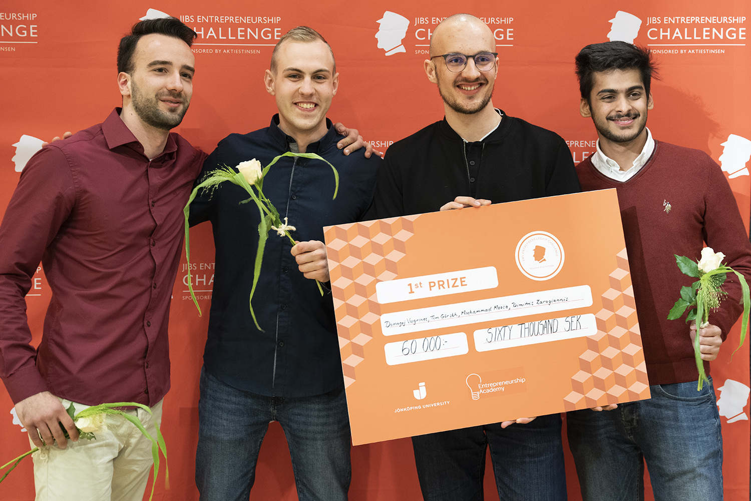 The winners of the JIBS Entrepreneurship Challenge 2022, from left: Dimitris Zarogiannis, Domagoj Vugrinec, Tim Alexander Görsch, Muhammad Moosa. "We believed in our idea from the beginning, and we are so happy to see that it took us all the way."