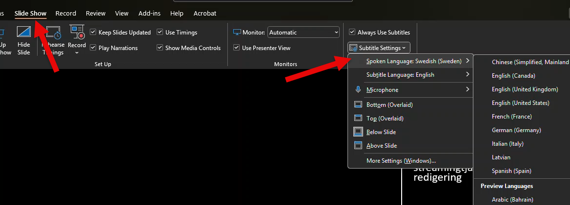 In the same place, you can also set the language you want the subtitles to be in. It can be the same language as the spoken language, but it is also possible for PowerPoint to automatically translate into another language. In other words, you can, for example, speak Swedish and get the subtitles in English, or vice versa.