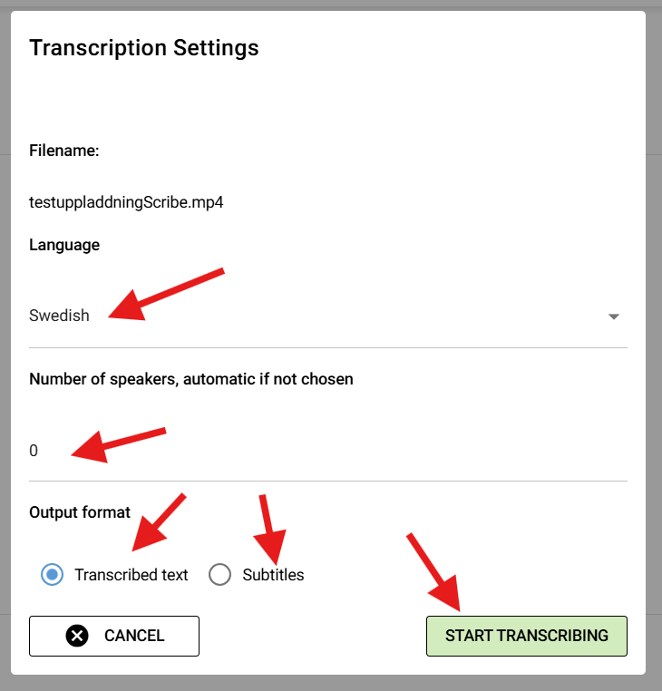 In the window that opens, you need to specify the language spoken in your file. Initially, there is support for Swedish, our other Nordic neighboring languages as well as English, German, French, Spanish, Italian, Russian and Ukrainian. More languages may be added over time. If you know how many different speakers there are in your audio, enter that number, but otherwise leave it at zero and Scribe will try to figure it out on its own. You also need to choose whether you want a transcript or a subtitle. When you are done, press "START TRANSCRIBING".