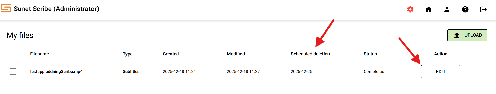 The status of your file will now change first from uploaded to transcribing and then when it is ready to completed. It is important to know that your file will only be saved in Scribe for seven days from the time you uploaded it and then it will be deleted automatically. You can see the date when deletion will take place under "Scheduled deletion". When your file is finished transcribing, press "EDIT" to see the result.