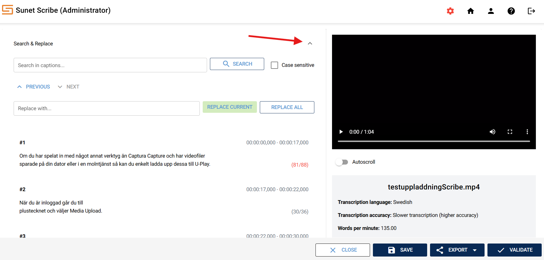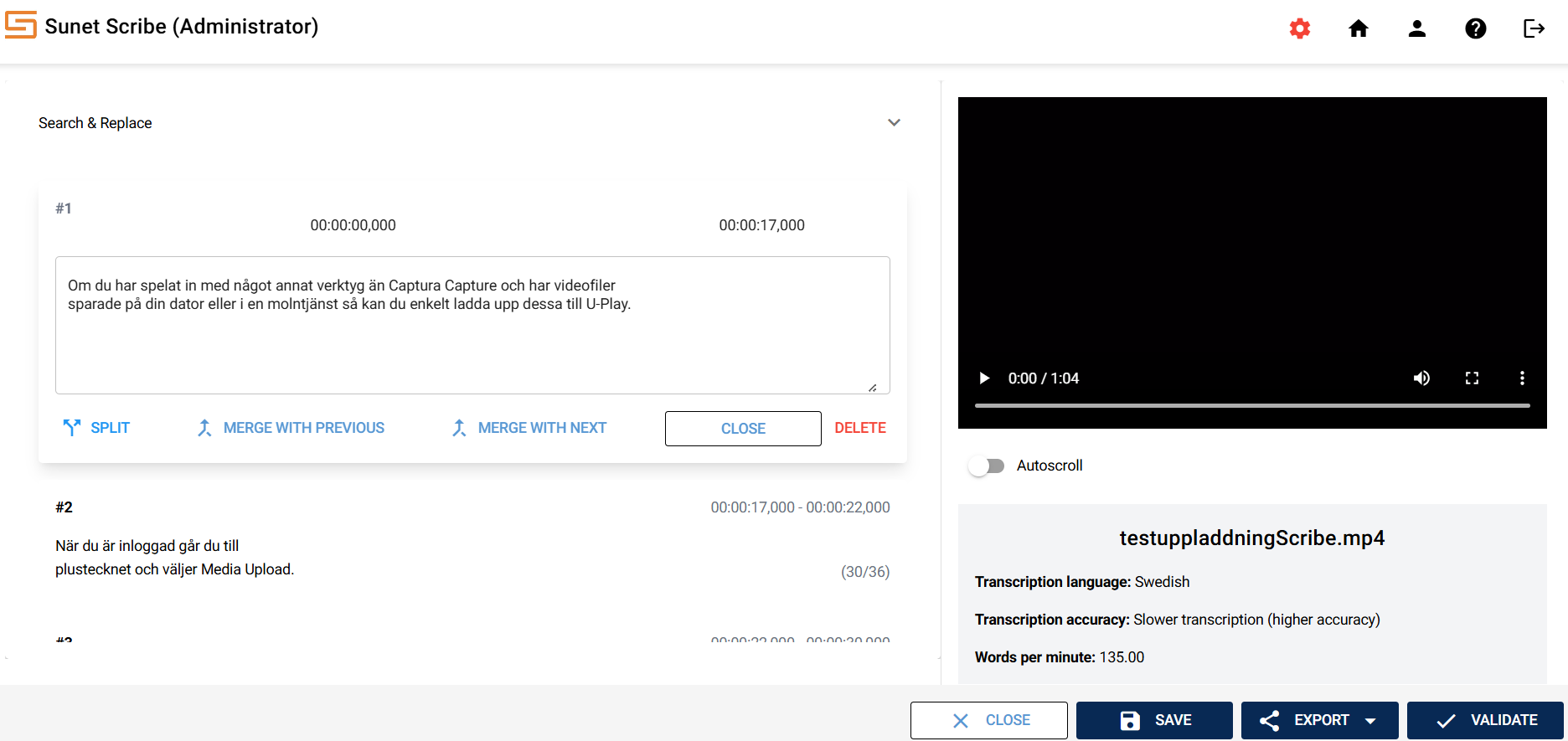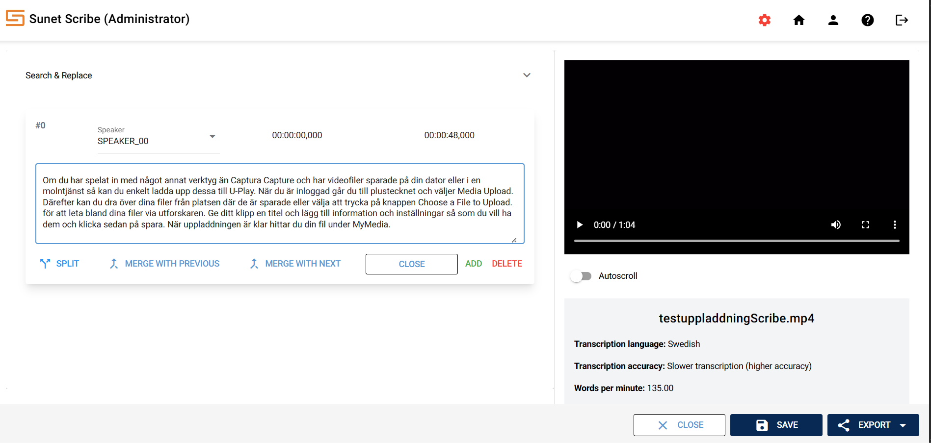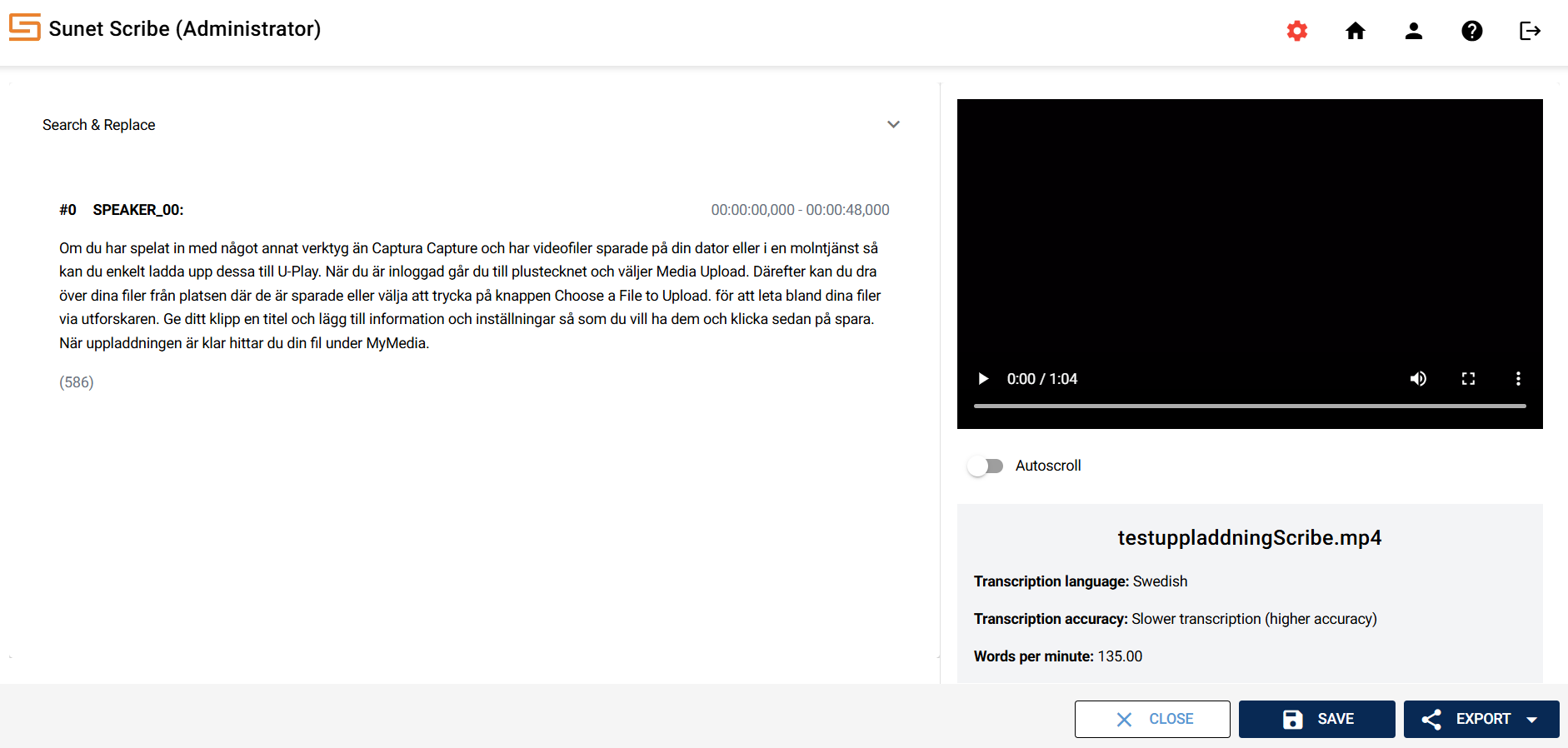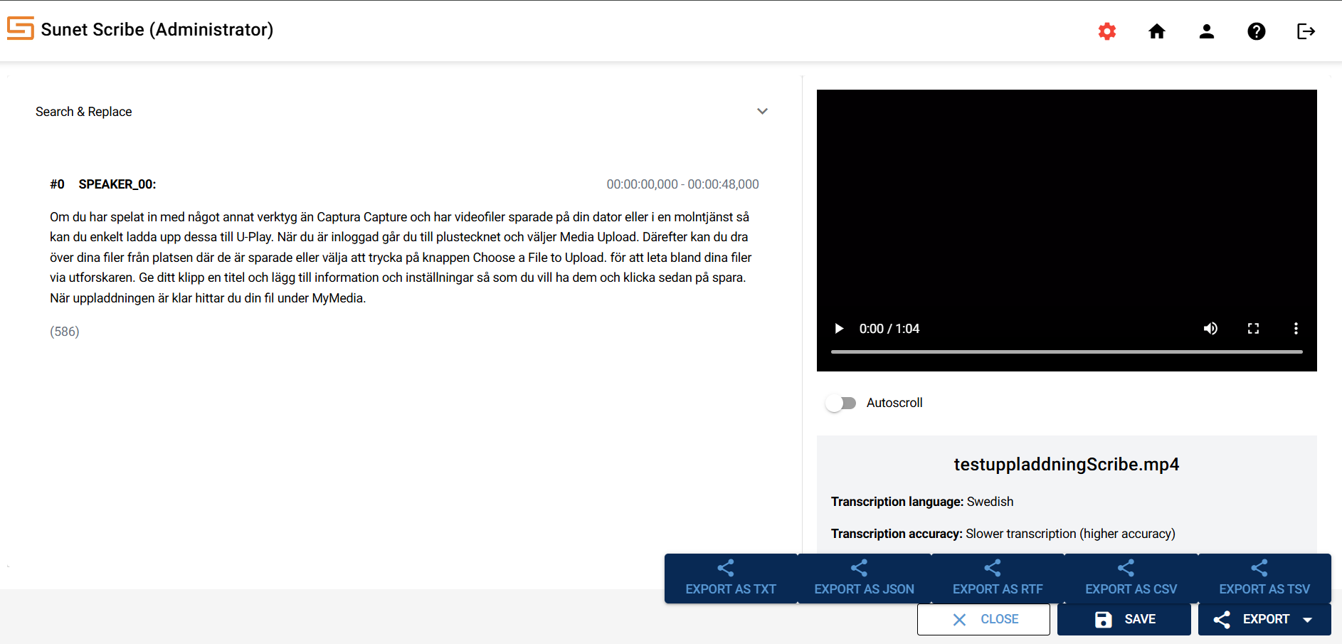 Sunet Scribe is a speech-to-text service (subtitling and transcription of audio and video files) developed by Sunet for the research and education sector. The service is based on open technologies, including the KB Whisper language model, which has been fine-tuned for Swedish by the National Library of Sweden. Transcription and processing is done within Sunet's own data center in Sweden, without external subcontractors.