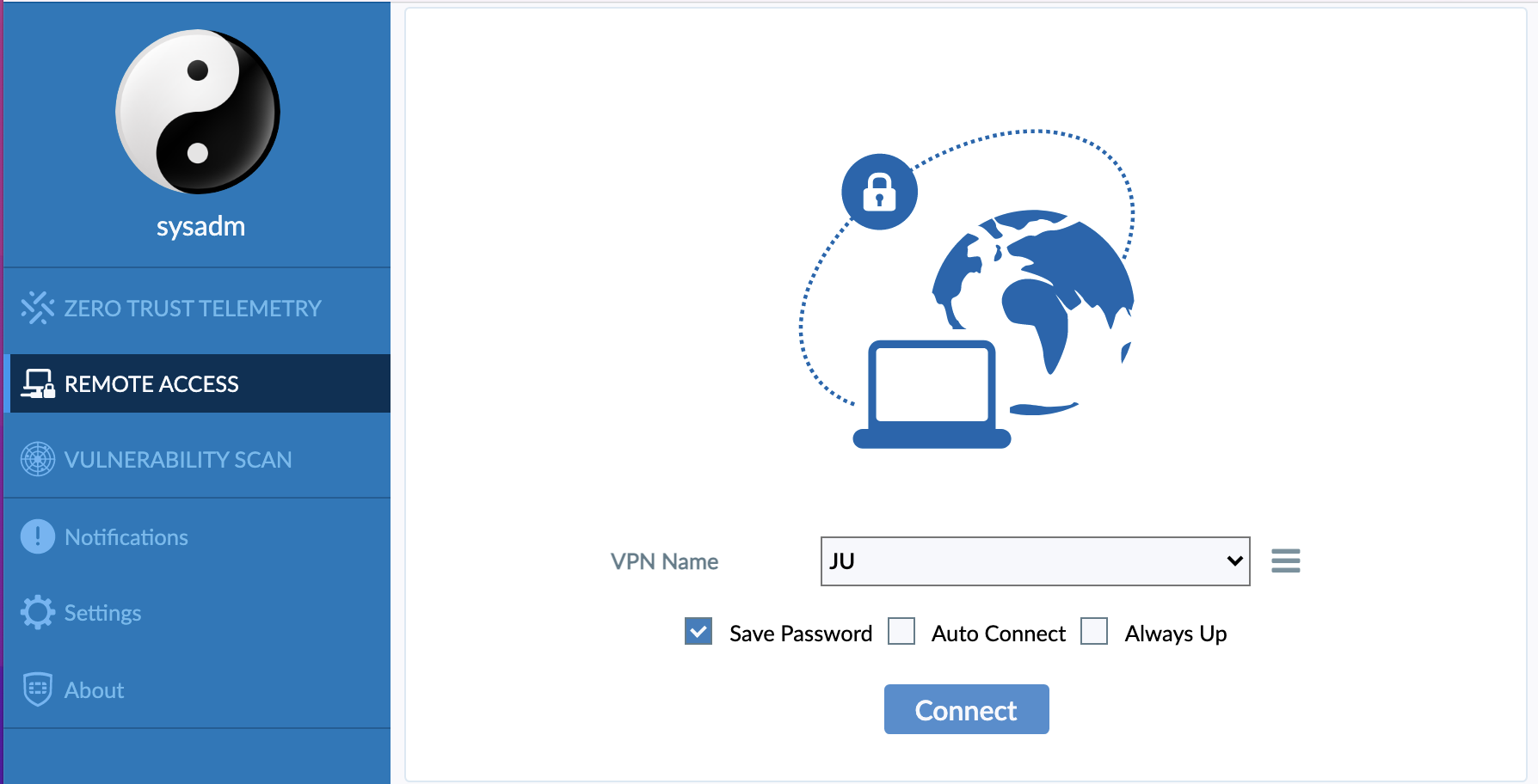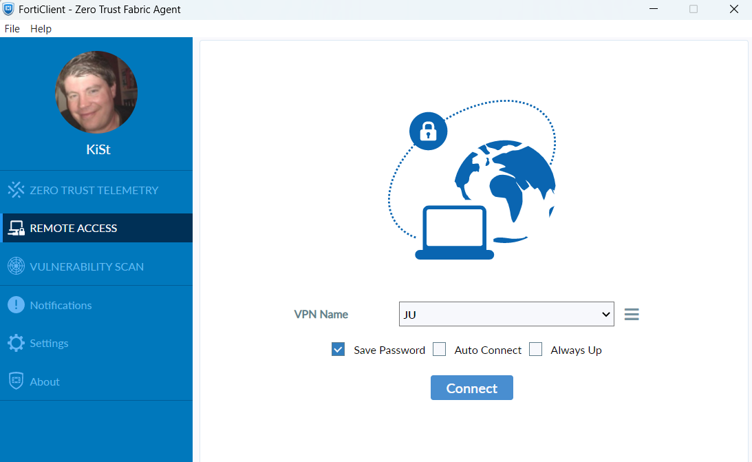 When you start FortiClient you will see this screen, the boxe Save password should allways be ticked. click on Connect.