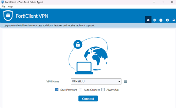 Most JU computers have the VPN client installed. Open the Start menu and search for FortiClient. FortiClient normally starts automatically and then has an icon in the system tray. If FortiClient is not installed, it can be installed from "Företagsportalen" ( "Company Portal") found in the start menu, when you've started Företagsportalent search for FortiClient. If this is the first time you start Företagsportalen, you need to choose the type of device you are using. If it is a JU computer (PC), select JU Employee Windows PC.