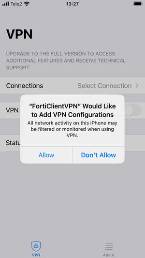 Click on Accept on the question about support (it is the only choice). Allow or deny notifications as you wish. Allow the app to add VPN configurations.