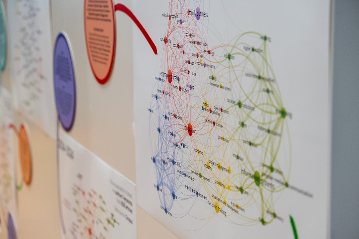 The University Library produces visual maps that show how research is published, cited, and interconnected. These visualisations are not only part of the exhibition but are also used by research environments to identify strengths and analyse development potential. By showcasing a strong research profile and clear collaborations, the visualisations can also help strengthen applications for research funding or degree-awarding powers.
