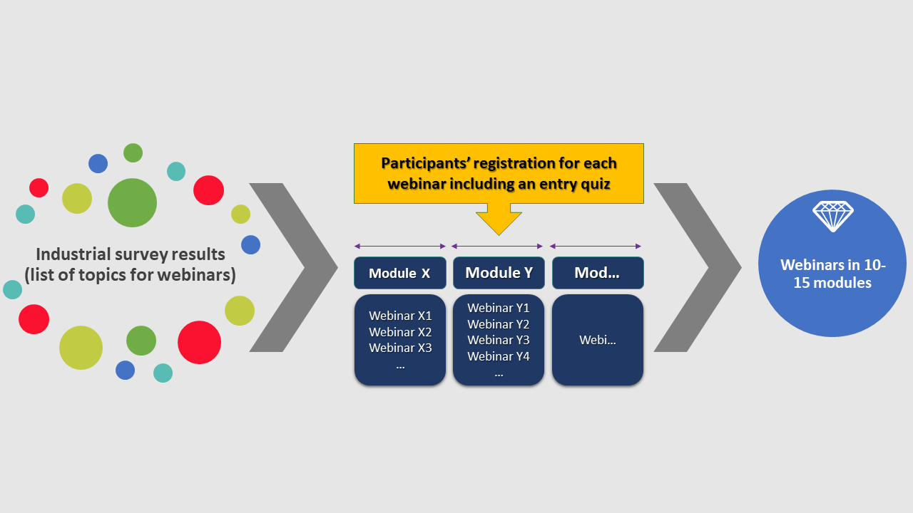 The project is kicked-off by reaching out to related metal and polymer industries within Sweden using an online survey, for the purpose of gathering the current needs for quick and online competence development. Accordingly, a series of webinars on related topics will be scheduled and categorized in various “modules”. The webinars in each module will be planned based on the progressive education method, but to provide more flexibility for participants, the modules will not be necessarily dependent to each other; i.e. a participant can join any modules without the need to attend previous modules necessarily.