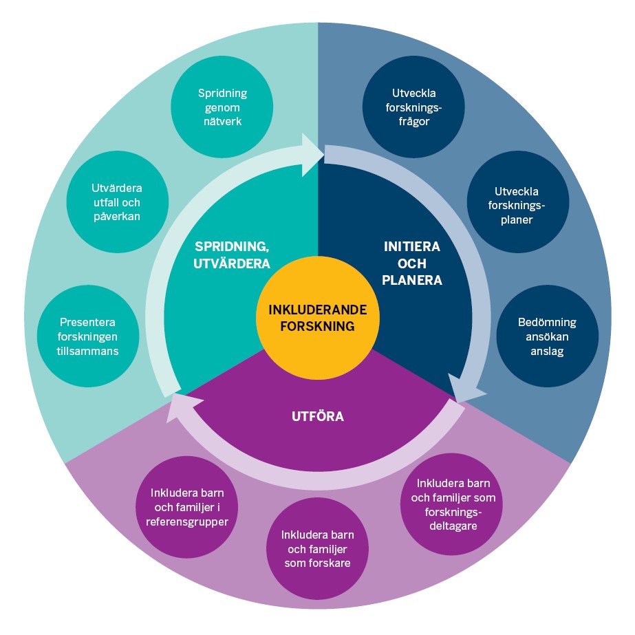 Figur 1. I figuren, som bilden till höger visar, förklaras processen för inkluderande forskning. Första delen handlar om att initiera och planera, den delen består av tre delar: utveckla forskningsfrågor, utveckla forskningsplaner och bedömning av ansökan och anslag.