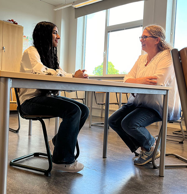 Malin Jakobsson (t.h) intervjuar en elev på Engelbrektsskolan