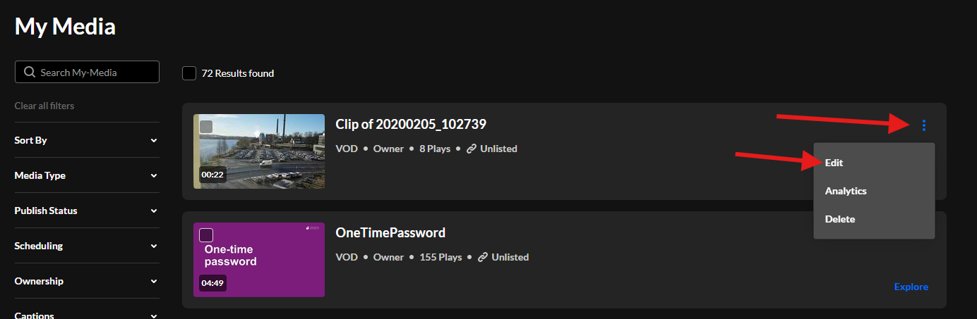 Din undertextning kommer inte att visas på din video förens du aktivt slår på den. Detta för att du ska hinna granska den och rätta till eventuella felaktigheter. När du vill aktivera din undertextning går du till Edit som du hittar under de tre prickarna bredvid Share knappen.