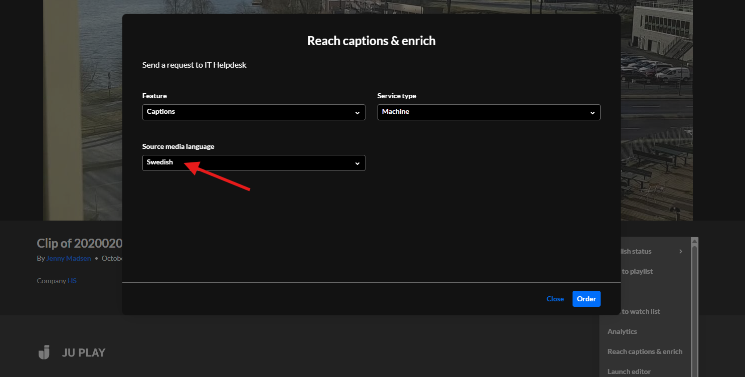 När din video är uppladdad och ligger inne JU Play har du möjlighet att beställa automatgenererad undertextning till den. För att göra det följ dessa steg: