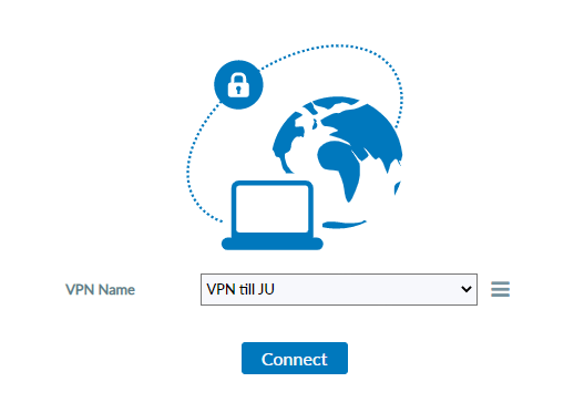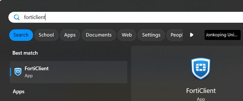 De flesta JU-datorer har VPN-klienten FortiClient installerad. Öppna startmenyn och sök på FortiClient. FortiClient automatstartar normalt sett och har då en ikon i systemfältet. Om FortiClient inte är installerad så kan den installeras från ”Företagsportalen” (alternativt "Company Portal") som du kan hitta via startmenyn, sök på FortiClient när du startat Företagsportalen. Om det är första gången du startar Företagsportalen får du välja vilken typ av enhet du sitter på. Om det är en JU-dator (PC) ska du välja JU Employee Windows PC.