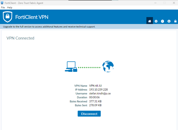 När du är uppkopplad ser det ut enligt nedan. Inaktivera genom att klicka på Disconnect.
