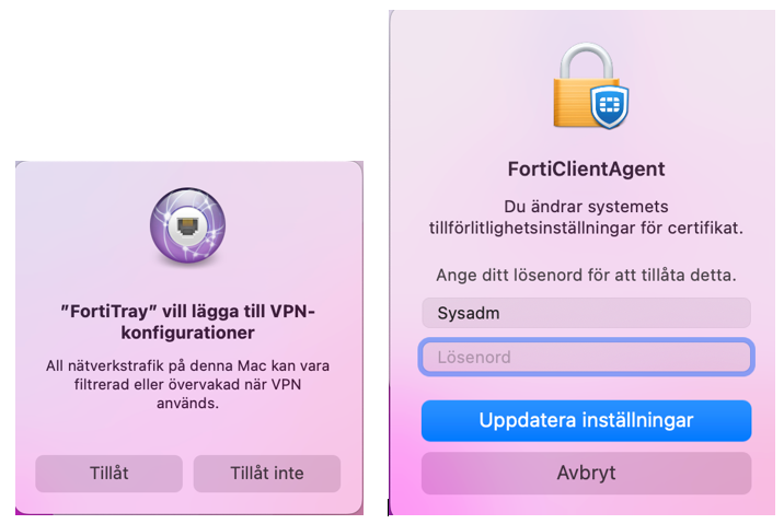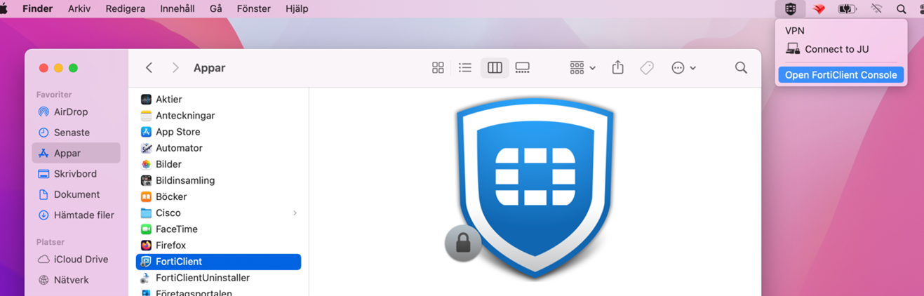 Detaljerade instruktioner för hur man installerar FortiClient VPN på Mac finns på Fortinets hemsida Länk till annan webbplats, öppnas i nytt fönster..
