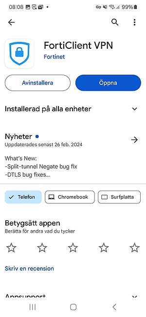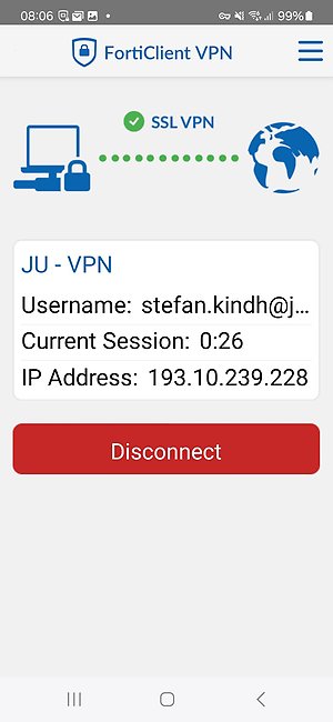 På JU-hanterade mobila enheter distribueras FortiClient VPN automatiskt. Ladda ner appen FortiClient VPN via AppStore eller via ”Play Butik” om du använder en privat enhet.