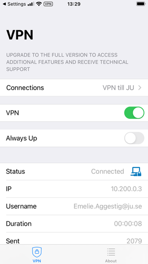 Anslut genom att i appen klicka på reglaget VPN. När du är uppkopplad ser det ut enligt nedan. Inaktivera genom att klicka på reglaget igen.