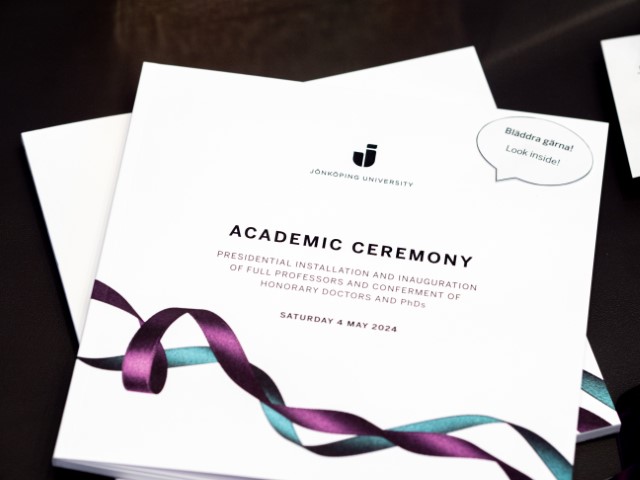 Jönköping University will celebrate the Academic Ceremony on Saturday, 4 May. The event will include professor installations and doctoral promotions. An exhibition featuring information about the ceremony and dissertations and other publications from the participating doctors, honorary doctors and professors, is now on display at the library.