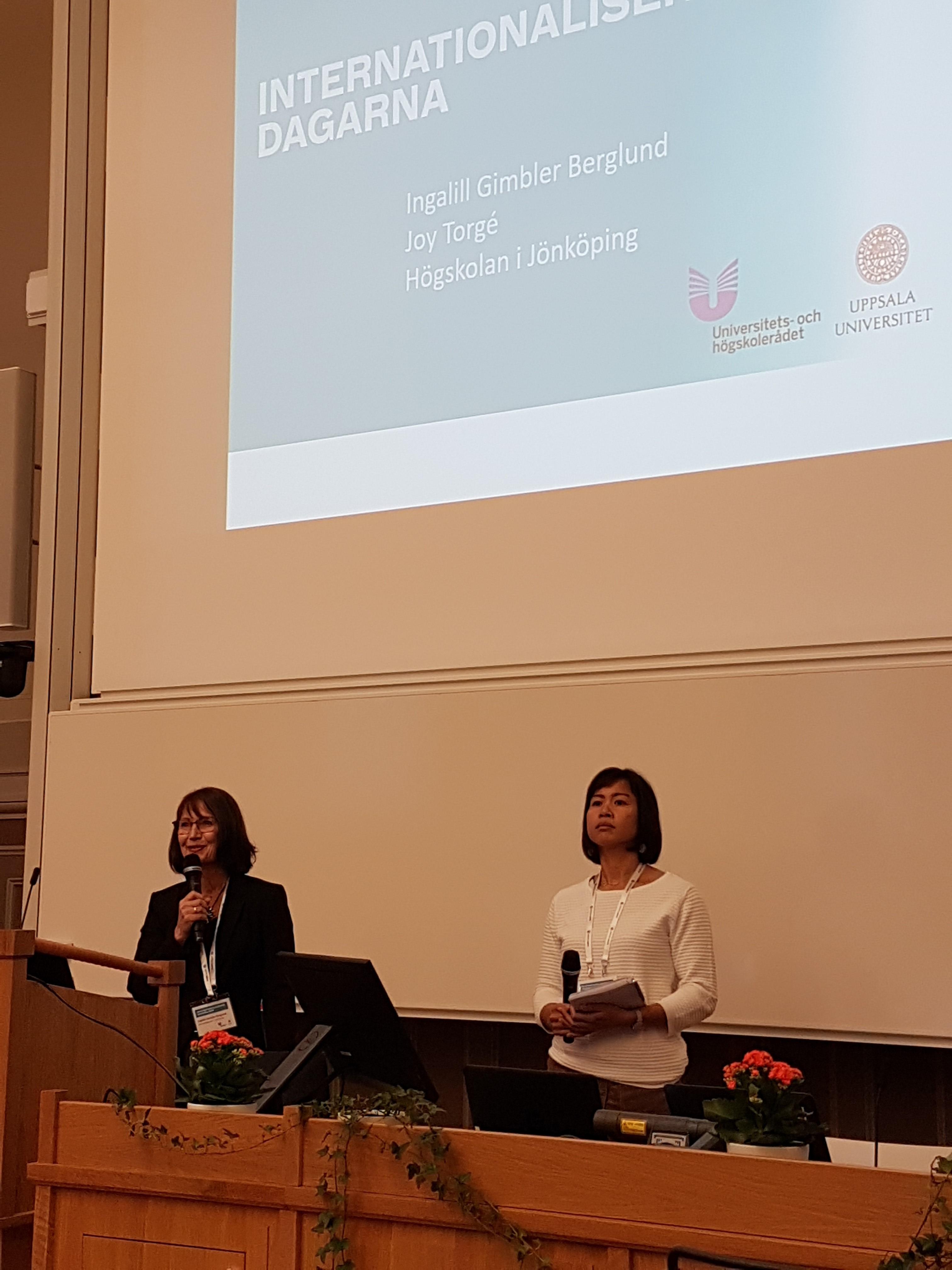 Vid Internationaliseringsdagarna i Uppsala representerades Hälsohögskolan av Ingalill Gimbler-Berglund, lärare och ordförande för Hälsohögskolans internationella råd på HHJ, och Joy Torgé, filosofie doktor i Äldre och åldrande på HHJ. Årets tema ”från strategisk agenda till handling” är kopplat till Agneta Bladhs Strategisk agenda för internationalisering, delbetänkande av Utredningen om ökad internationalisering av universitet och högskolor.