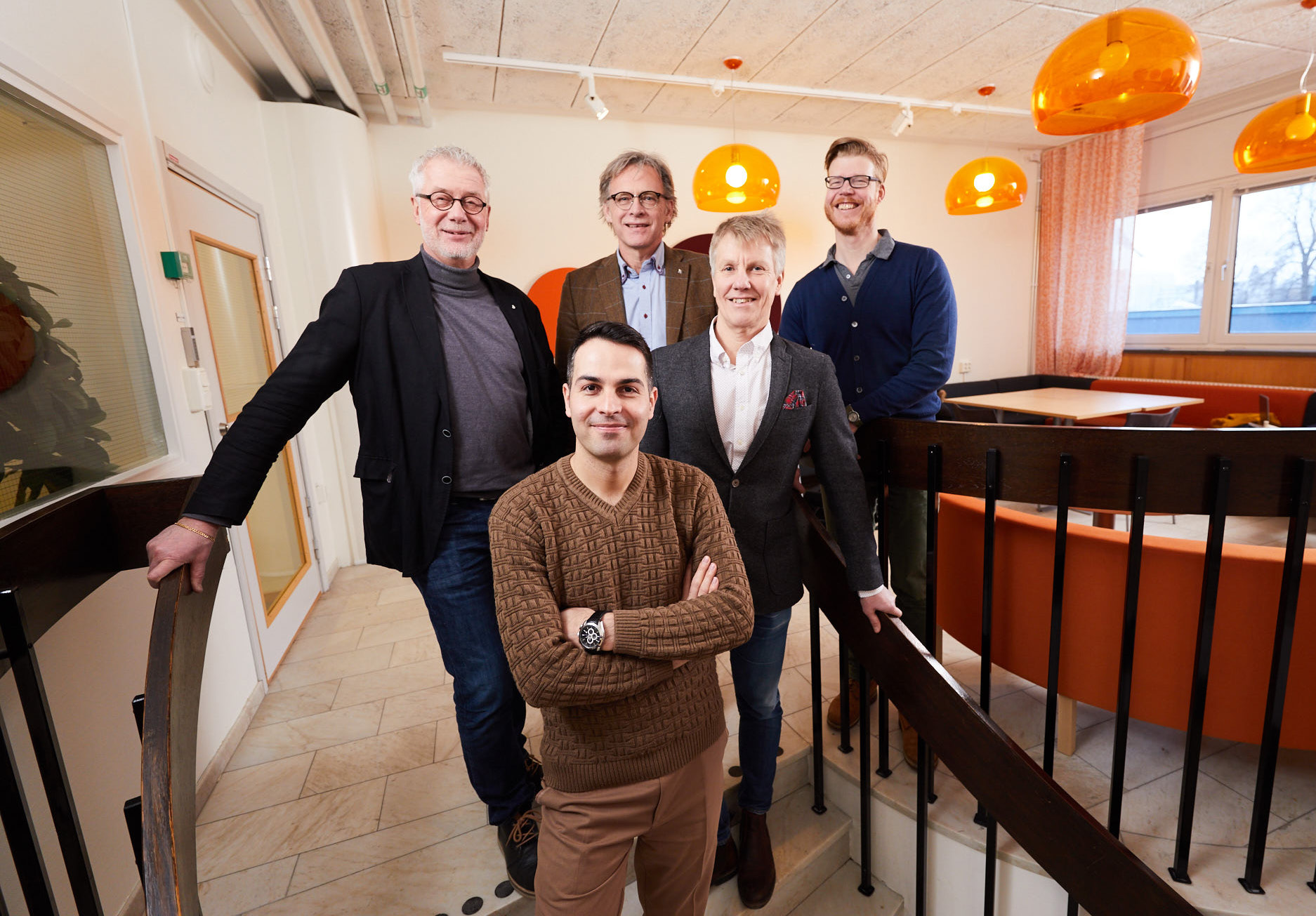 Amir Pakpour tillsammans med forskare på Hälsohögskolan under halvåret som gästföreläsare och forskare 2016. Från vänster Bengt Fridlund, Dan Malm, Anders Broström och Henrik Jansson. Amir Pakpour står längst fram. Foto: Patrik Svedberg
