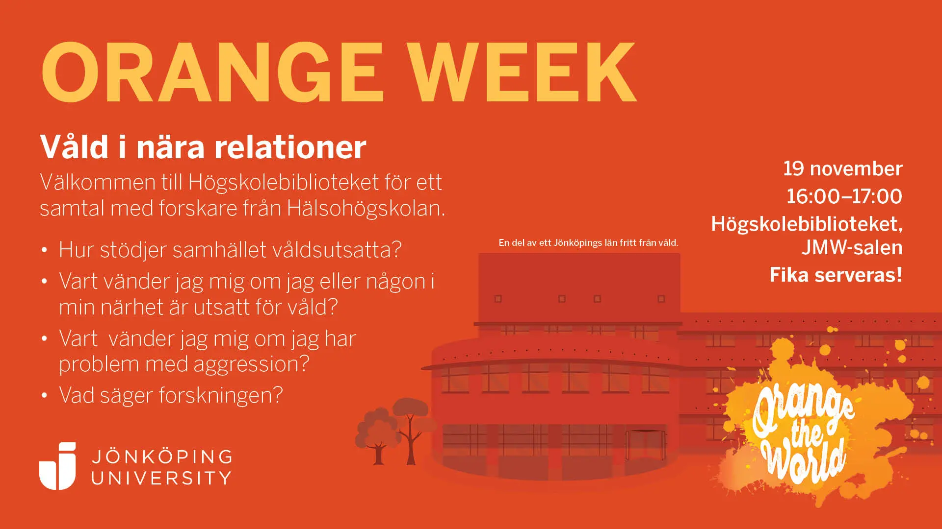Den 18-24 november uppmärksammas Orange Week – en vecka fri från våld i Jönköpings län. Under vecka 47 genomförs flera olika aktiviteter med syfte att sprida kunskap och engagemang kring våld i nära relationer och mäns våld mot kvinnor. Jönköping University (JU) bidrar genom att bjuda in allmänheten till Högskolebiblioteket, där forskare från nätverket Tema våld på Hälsohögskolan kommer att diskutera ämnet.
