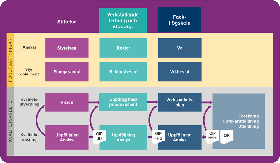 • kvalitetsutvecklingsplanerna inom respektive fackhögskola sammanfattas till en övergripande utvecklingsplan för hela fackhögskolans forskning respektive utbildning (QIPFHS), och dessa är underlag till fackhögskolans verksamhetsplan,