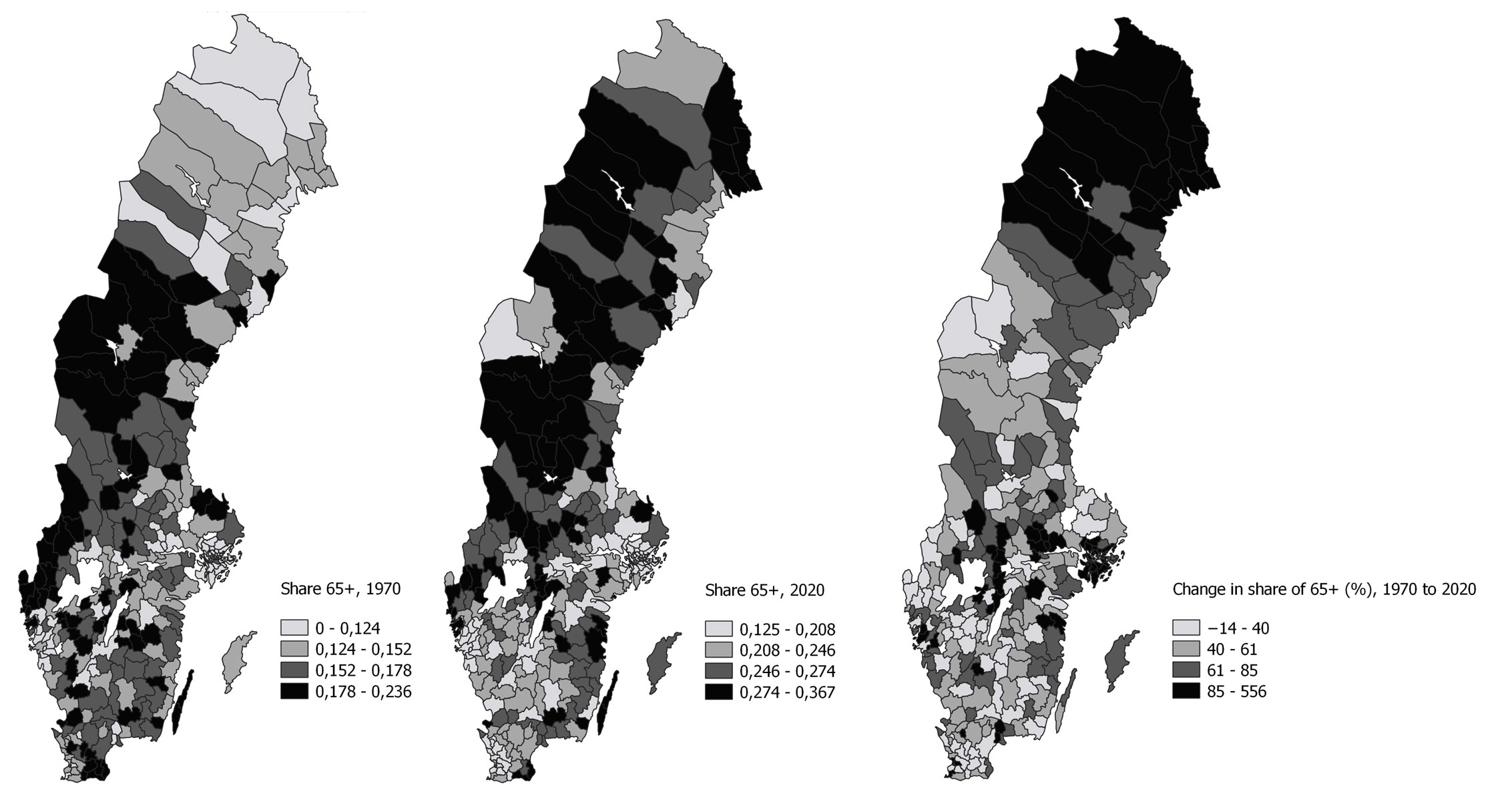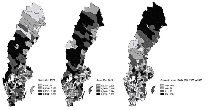 Zoom imageFigur 1. Andelen över 65 I Sveriges kommuner 1970 (vänster), 2020 (mitten), och den procentuella förändringen från 1970 till 2020 (höger). Klicka på bilden för att zooma.
