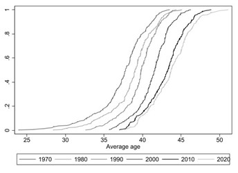 För att tydliggöra förändringen över tid visar nästa figur den kumulativa fördelningen av Sveriges kommuner (medelåldern) sedan 1970 fram till 2020. Varje linje visar fördelningen under ett decennium. Figuren visar tydligt att det har skett ett demografiskt skifte där vi numera har en klart högre medelålder och att fördelningen mellan kommuner minskar, det vill säga kommunerna blir äldre och äldre och variationen mellan kommunerna minskar.