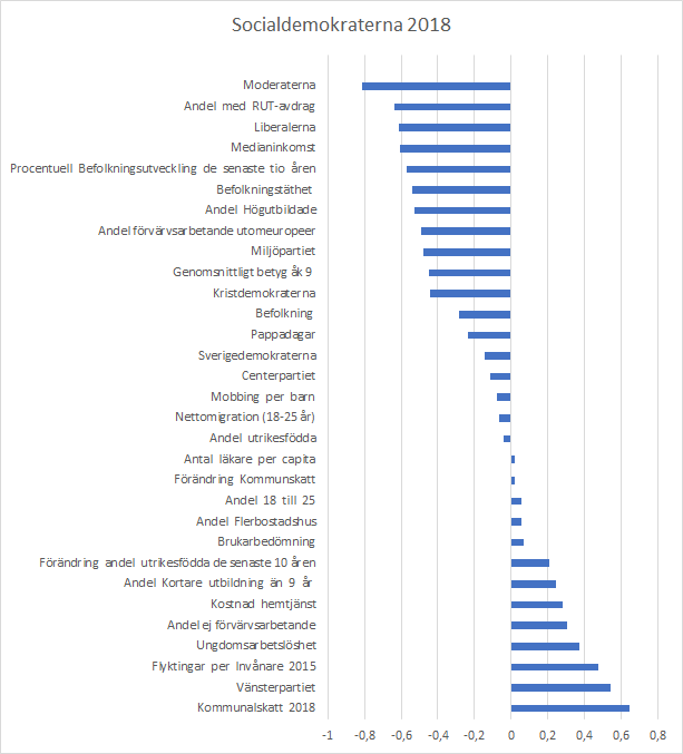 Här är det oerhört viktigt att notera att korrelationer som tittar på samband mellan två faktorer ALDRIG testar om den ena orsakar den andra. Vi kan alltså inte säga något om orsakssambanden utan tittar ENBART på relationer. Det är också viktigt att komma ihåg att många av dessa variabler samvarierar i hög grad och fångar liknande strukturer i kommunerna.