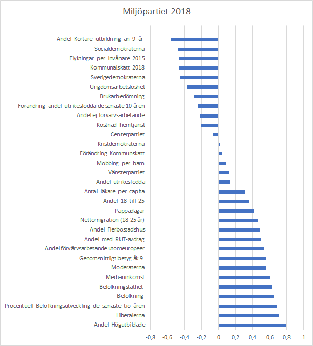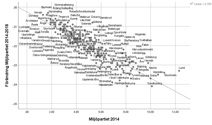 Precis som var fallet med Socialdemokraterna så backade Miljöpartiet mest i de kommuner där de fick en högre andel röster i valet 2014. Korrelationen är -0,875 och signifikant. Värt att notera är att Miljöpartiet tappade procentandelar i samtliga kommuner i landet.