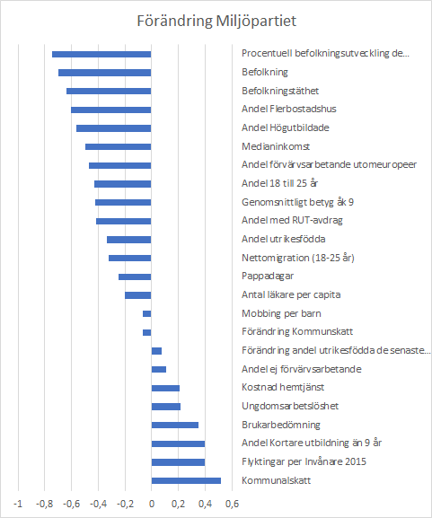 Mest tappade Miljöpartiet där befolkningsutvecklingen varit stark, befolkningen är relativt stor och man bor tätt. I dessa kommuner finns det en högre andel flerbostadshus och en högre andel högutbildade. I de kommuner där Miljöpartiet tappat minst var kommunalskatten högre, man tog emot fler flyktingar per invånare 2015, en högre andel hade kort utbildning och brukarbedömningen inom hemtjänsten var relativt sett högre.