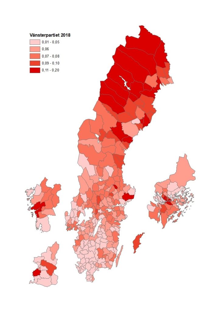 Kartan nedan visar anden röster på Vänsterpartiet till riksdagen i valet 2018: