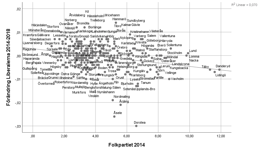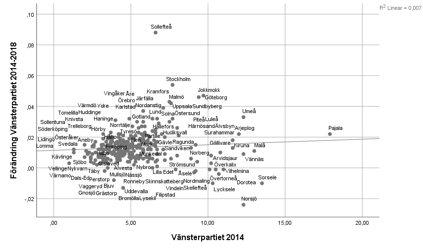 De tre kommuner där man vann flest procentandelar var Stockholm, Nacka och Solna, medan man tappade flest procentandelar i Sollefteå (där tappet var drygt 18 procentandelar), Haparanda och Ragunda. Mer generellt, var det då så att partiet vann/tappade mer i kommuner där de redan 2014 hade ett starkare stöd? Figuren nedan visar förändringen för partiet i relation till siffrorna i valet 2014: