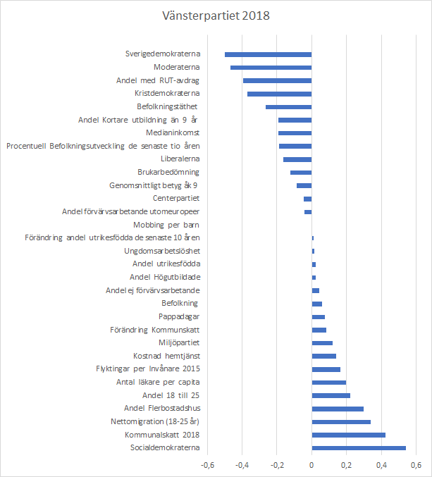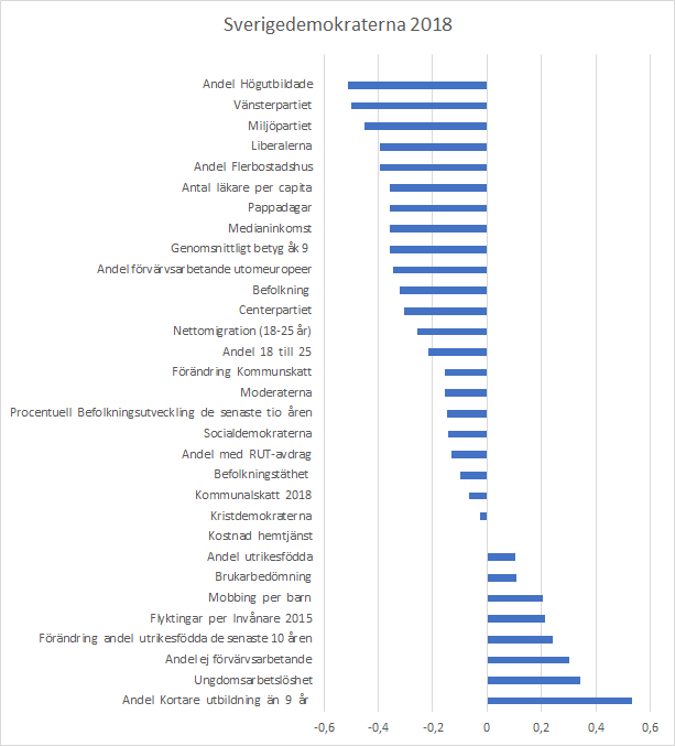 Låt oss därefter se hur valresultatet 2018 relateras till våra socio-ekonomiska faktorer: