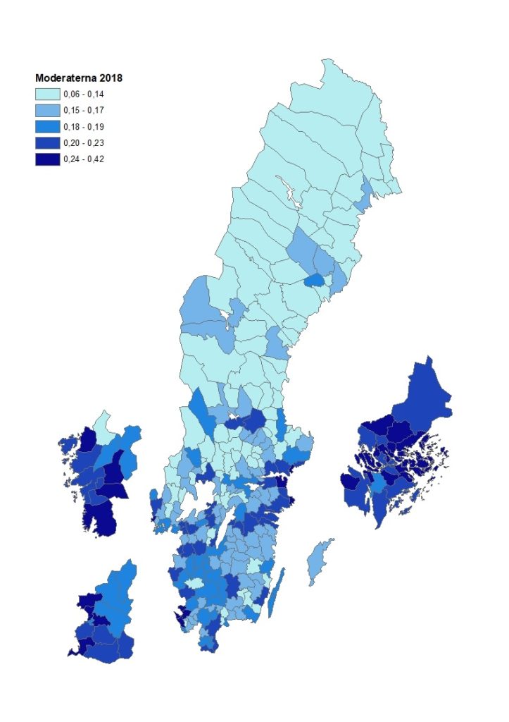 Kartan nedan illustrerar andelen röster som Moderaterna fick i de svenska kommunerna: