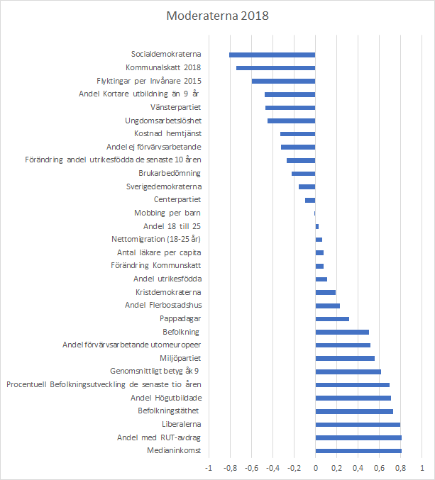 Vad kännetecknar de kommuner som i högre grad röstat på Moderaterna i detta val? Figuren nedan visar sambanden: