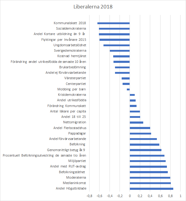 Partiet får en högre andel röster i kommuner där utbildningsnivån är högre liksom medianinkomsten. Moderaterna får en högre andel röster i samma kommuner liksom Miljöpartiet. Här finns också fler individer som utnyttjar RUT-avdrag. De kommuner där Liberalerna får lägst stöd har högre kommunalskatt, fler röstar på Socialdemokraterna, det finns en högre andel med kort utbildning och man tog emot fler flyktingar per invånare 2015.