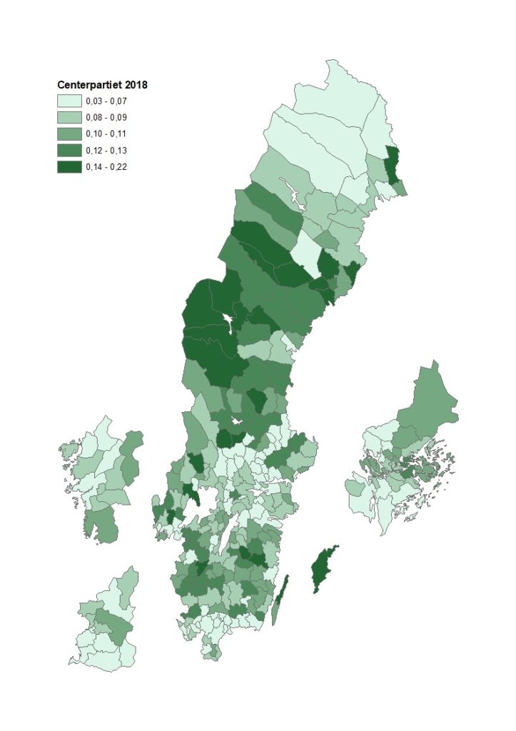 Allra högst stöd har Centerpartiet i Åre, Krokom och Robertsfors, medan stödet är som lägst i Bromölla, Bjuv och Gällivare.