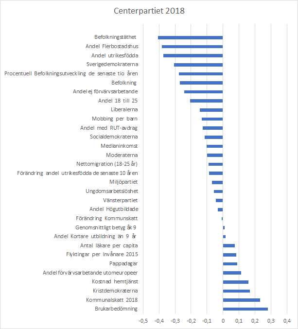 Centerpartiet är starkast i kommuner där man gett ett högt betyg i brukarbedömningen av hemtjänsten, där kommunalskatten är hög och där man i högre grad röstar på Kristdemokraterna. Partiet har ett svagare stöd i kommuner där befolkningstätheten är hög, där det finns en högre andel flerbostadshus, där man har en högre andel utrikesfödda och där fler röstar på Sverigedemokraterna.