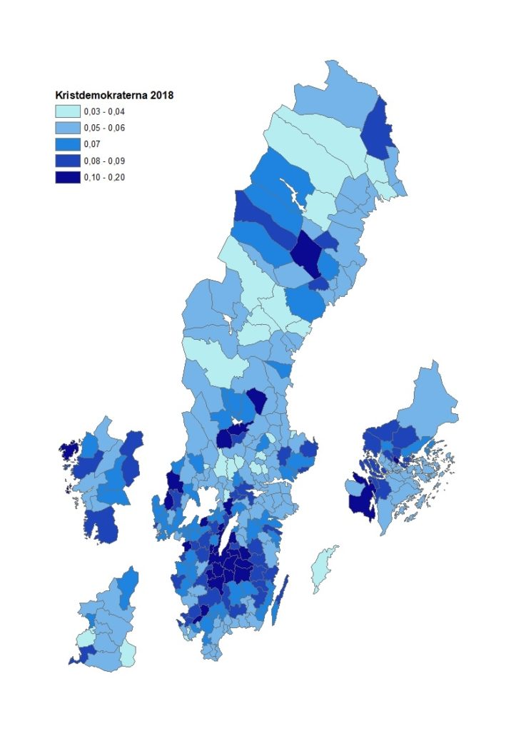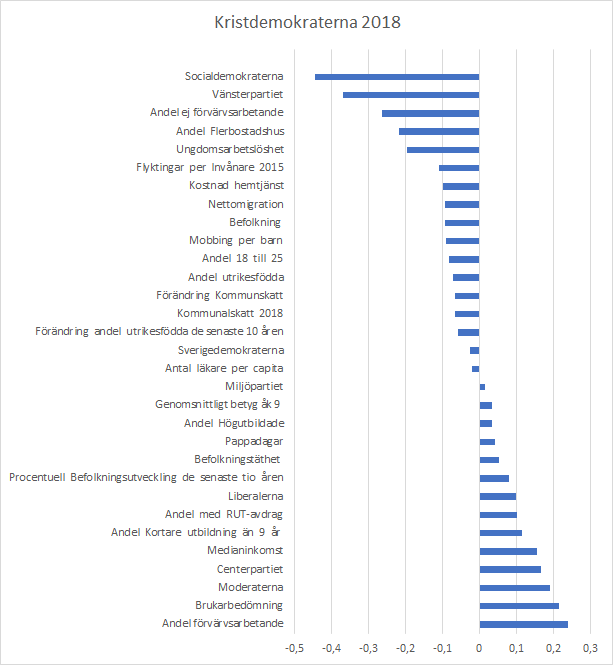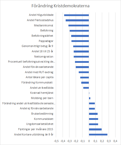 En högre andel röster fick partiet i kommuner där en högre andel av individerna födda i ett land utanför Europa förvärvsarbetar, där man är mer nöjd med hemtjänsten, där Moderaterna och Centerpartiet får fler röster och där medianinkomsten är högre. En lägre andel röster får Kristdemokraterna i kommuner där en högre andel röstar på Socialdemokraterna eller Vänsterpartiet. Det finns en högre andel flerbostadshus och en högre ungdomsarbetslöshet.