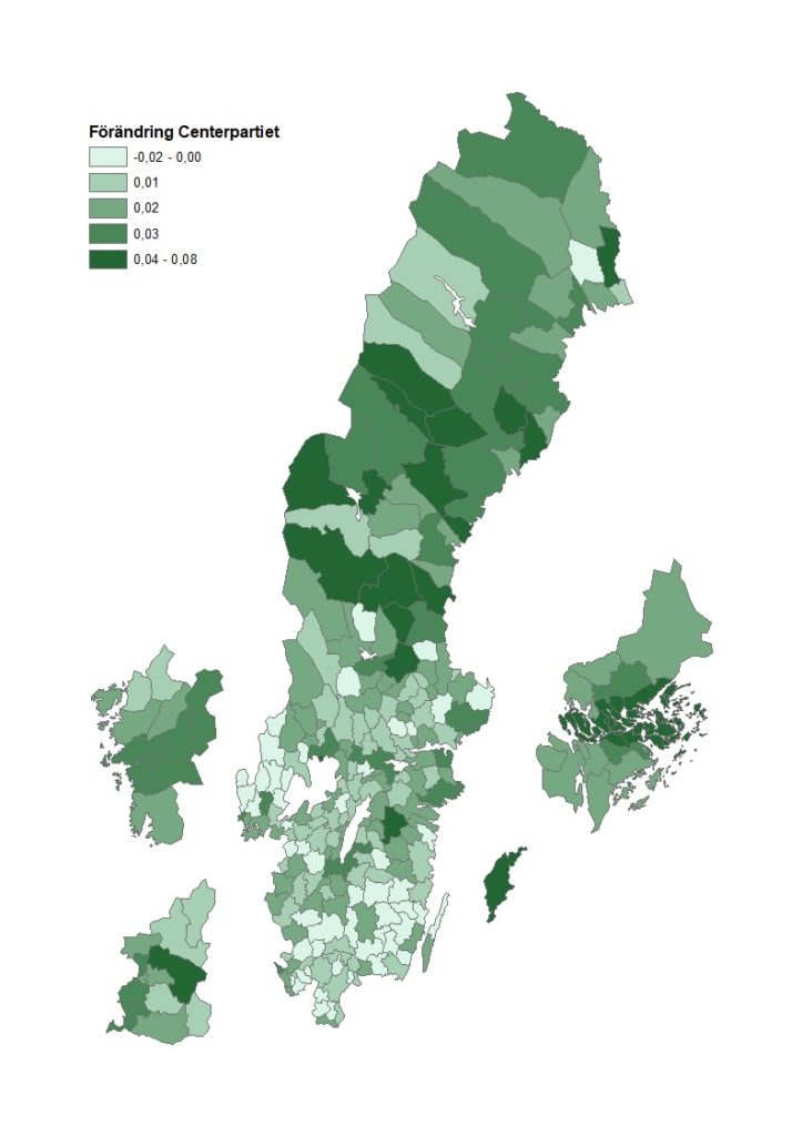 Förändringen i stödet till Centerpartiet mellan valen 2014 och 2018 visas i kartan nedan: