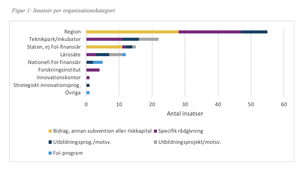 Figur 1 visar insatser per typ av organisation. Regionerna står nästan hälften av de totalt 116 insatser som gjorts. Deras insatser handlar ofta om omställningscheckar på 25–100 kSEK som i de flesta fall riktas till särskilt utsatta branscher, eller företagsjourer där regionernas näringslivsavdelningar, inte sällan tillsammans med anställda på Nyföretagarcentrum, Coompanion eller inhyrda enmanskonsulter, erbjuder specifik rådgivning kopplad till krisen. Teknikparker och inkubatorer ingår i några fall i företagsjourerna (som också förekommer på kommunal nivå) men deras rådgivande insatser är i de flesta fall mer fristående initiativ. Det förekommer också att de anordnar insatser inom utbildning eller kompetensutveckling, från webinarier till kurser av programliknande karaktär. Lärosätenas insatser handlar i de flesta fall om nya, kortare utbildningar eller om att forskare erbjuder rådgivning. Det är i tolkningen av figuren viktigt att ha i åtanke att vissa insatser väger tyngre än andra. Exempelvis är flertalet statliga insatser mycket betydelsefulla, som Almis brygglån och det statliga tillskottet på 400 MSEK till Almi Invest, medan andra listade insatser berör betydligt färre företag.