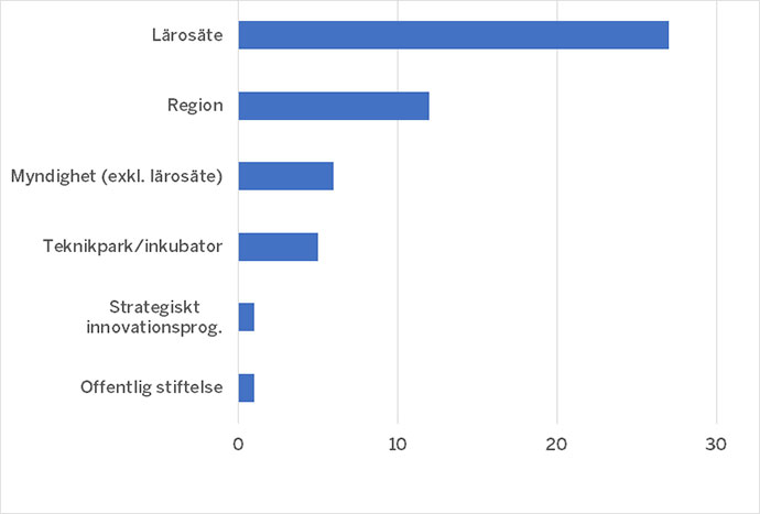 Totalt 90 av de kartlagda organisationerna är teknikparker, inkubatorer, strategiska innovationsprogram eller innovationskontor. Dessa svarar sammantaget endast för sex insatser. Troligen förklaras det av att de nästan alltid är små och (kanske därför) oftast bara tar en mäklande roll eller agerar diskussionspartner, men det är ändå ett påfallande magert utfall.