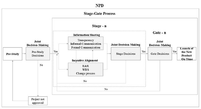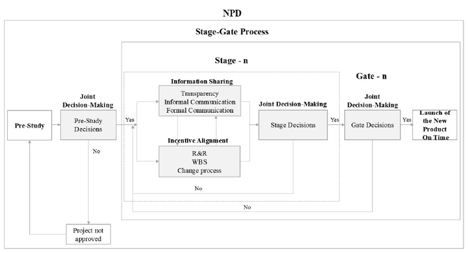 First, information sharing refers to the distributions of useful information for systems, people or units in the organization. The main elements founded in this research related to this factor were transparency since it builds trust in interpersonal relationships facilitating collaboration among team members, and informal and formal communication as a way to share and store knowledge and do not miss critical information that can impact the outcome of the project. Then, incentive alignment implies the fact that all team members of a project should understand the goals and be aligned on the deliverables. In this regards, to ensure that the team can compromise and deliver what is expected, we found out that the project needs: to define clearly the roles and responsibilities (R&R) of each member, to develop a detailed work breakdown structure (WBS) with manageable tasks and lead times and to have a defined change process, so everyone gets informed in the right time and can take measurements when there are changes in the scope of the project and or in the technical part of the product. Finally, joint-decision making means that all members should be involved and accountable for the decisions that are taken during the whole project. Thus, we identified that the alignment during the decision-making in the pre-study, stages and gates is crucial to build the collaboration of the cross-functional teams due to the fact that it creates a sense of team effort and helps to come to future agreements.
