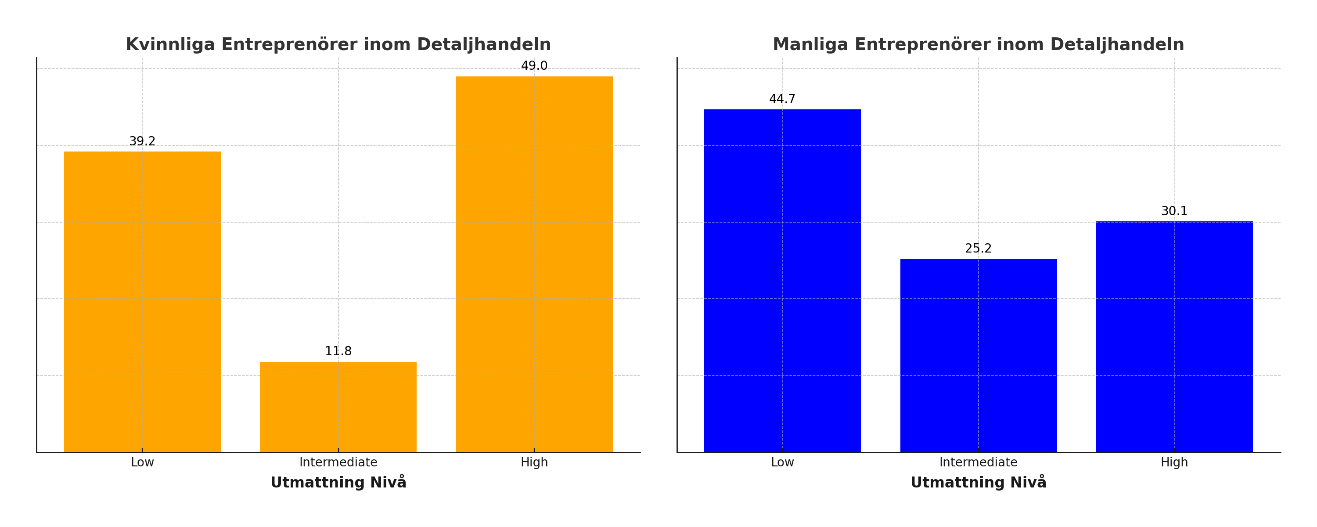 Data visar på en uttalad könsskillnad, där nästan hälften av de kvinnliga entreprenörerna inom detaljhandelssektorn rapporterar höga nivåer av utbrändhet, jämfört med bara en tredjedel av de manliga entreprenörerna (se figur 1). Intressant är att denna skillnad i utbrändhetsnivåer verkar vara specifik för kvinnliga entreprenörer inom detaljhandeln och inte gäller för manliga och kvinnliga anställda som arbetar under dessa entreprenörer.