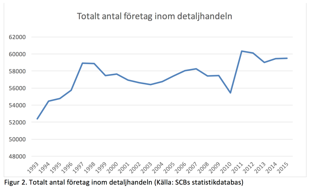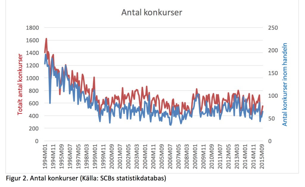 Efter några svåra år ser det ljusare ut för företagare inom detaljhandeln. Julhandeln väntas slå rekord (igen!) (källa: HUI Länk till annan webbplats, öppnas i nytt fönster.). Antal konkurser har minskat under 2015 och samtidigt har antalet företag legat på en hög nivå. Faktum är att antalet konkurser både totalt och inom branschen har minskat under de senaste tjugo åren samtidigt som antalet företag har ökat (se Figur 1 och 2).