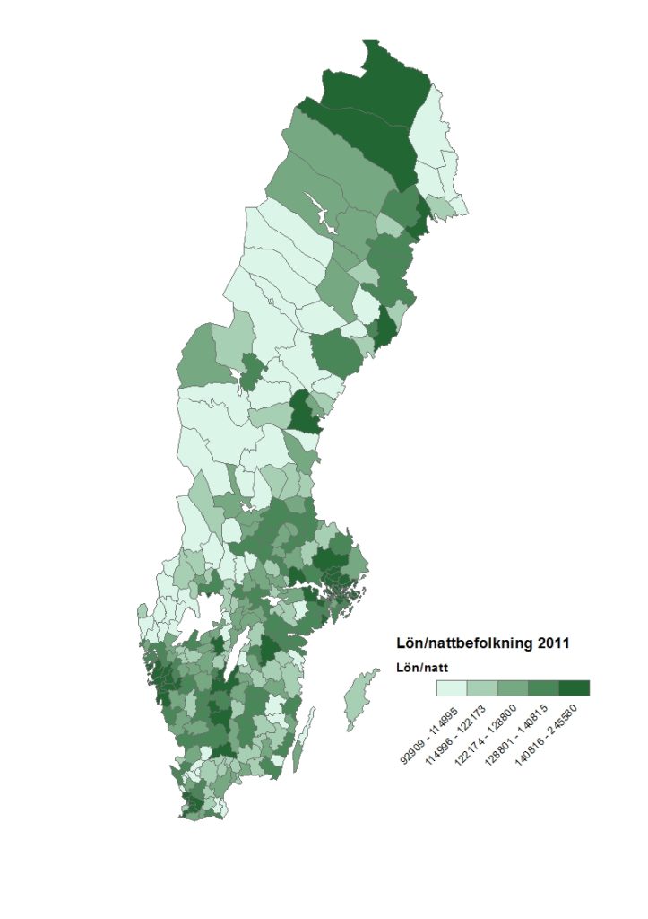 Därefter kan man övergå till att titta på hur lönesummorna fördelas över landet. Dessa registreras var man bor (nattbefolkning) vilket gör att de inte behöver sammanfalla med produktionen. I kartan nedan ser vi lönesummor per capita och vi ser betydelsen av städer och deras skalfördelar. Med några få undantag så har stora delar av norra Sverige relativt låga lönesummor per capita. De största koncentrationerna finns i storstadsregionerna. Där finns många lokaliseringsfördelar för både företag och hushåll. Det finns ett stort utbud av tjänster, restauranger och varor men det finns även ett stort och varierat utbud av jobb. Dessa faktorer innebär att det finns en positiv samvariation mellan befolkning, sysselsättning, tillväxt av tjänsteföretag, andel högutbildad arbetskraft och därmed även lönesummornas storlek. Det är även därför många företag ser städer som den mest attraktiva platsen för huvudkontor och utvecklingsverksamhet.