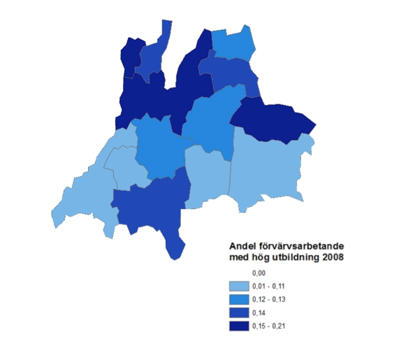 I kartan nedan ser vi en faktor som på ett typiskt sätt visar att Jönköpings län är ett län med mycket landsbygd: hur många av de som arbetar har en universitetsutbildning? Vi ser att andelen högutbildad arbetskraft är högre nära Jönköping och lägre i kommuner med en större befolkning. Detta är en indikator på hur stor sannolikhet det är att företagen är faktiskt håller på med innovationer. Innovationer kräver kunskap som ibland kan mätas i utbildning (men inte alltid!). Men det kan även visa på hur stora möjligheter företagen har till att hitta någon lämplig partner att samarbeta med för att slå ihop krafterna och tillsammans komma på någon ny produkt, tjänst eller produktionsprocess. En sådan innovation kan exempelvis vara en ny typ av skruv som tål särskilt stora påfrestningar, ett nytt it-system för företag inom hushållsnära tjänster, eller en ny logistiklösning för företag inom möbelindustrin. Så, hur ser det ut med innovationer i länet och har samarbeten i någon betydelse?